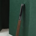 Caneta Esferográfica, Tinta azul, Mecanismo de torção, Corpo de metal e madeira e clip de metal.